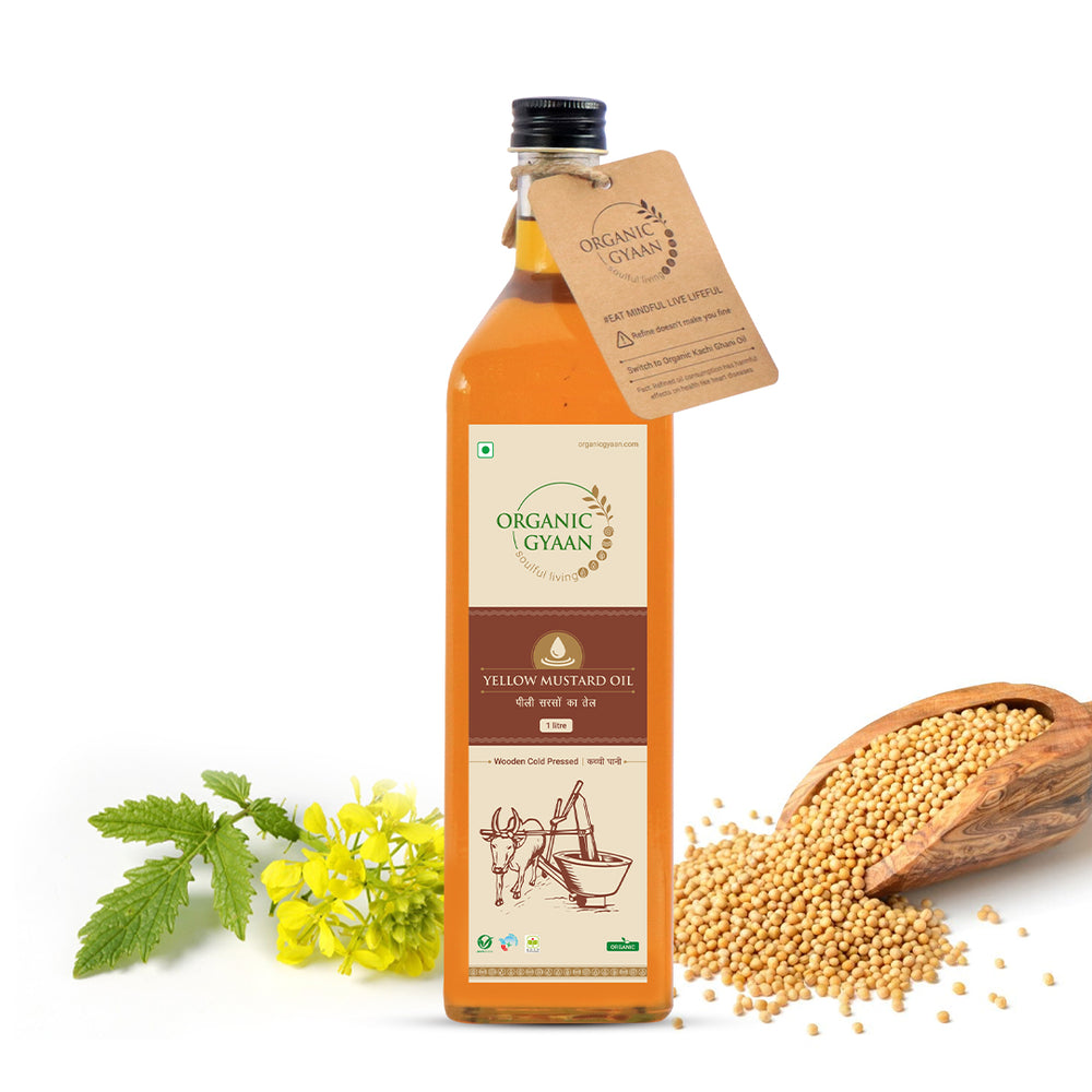 Yellow Mustard Oil, also known as yellow sarso oil, is an all-purpose flavourful oil. Yellow Mustard Oil is full of rich nutrients, vitamins, and minerals that have multiple uses and benefits. From cooking to skincare to hair care, it aids as one of the best solutions for your overall health. But it is imperative to choose top-quality Yellow Mustard Oil to enjoy its benefits at the best. Organic Gyaan offers you authentic wooden cold-pressed yellow mustard oil which is organic, unrefined, and processed at a very low temperature.