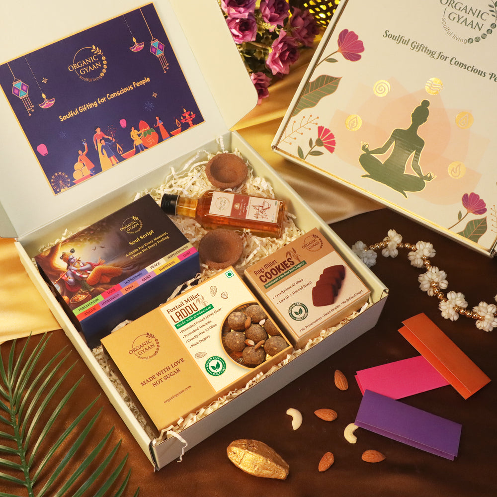 The Soul Care Hamper is a mindful collection designed to support your health and bring peace to your daily life. It combines nutritious snacks with natural, spiritual items that reflect the essence of traditional Indian living.