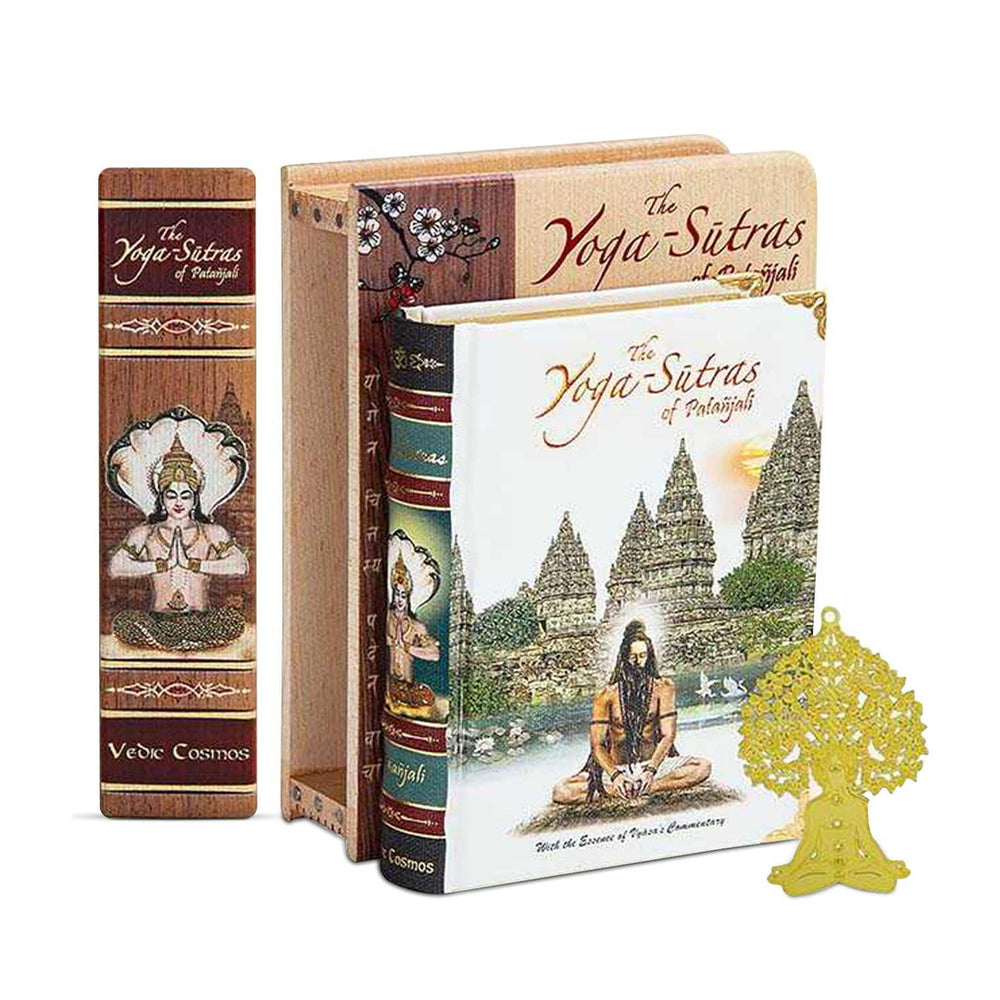 It includes the Yoga Sutras of Patanjali book, beautifully packed in a wooden box made from maple, walnut, and beige wood, along with a laser-cut metal bookmark.