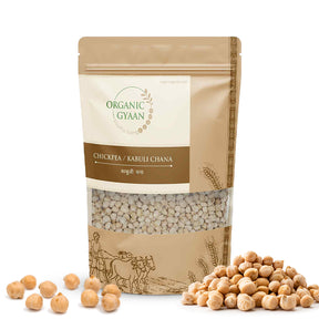 Kabuli Chana, also known as chickpeas or white Chana, is grown organically, ensuring a high-quality and environmentally friendly product. It has a light beige or cream colour. The individual chickpeas are round and smooth in appearance.